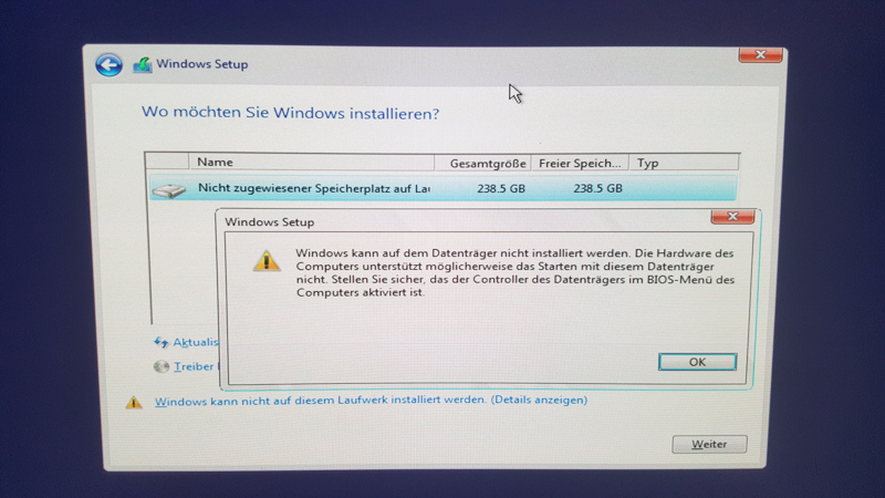 Hallo, ich habe mir neulich aus Amazon eine gebrauchte SSD(Intenso 256GB) gekauft. Ich wollte heute Windows 10 darauf installieren, bekam dann aber diesen Fehler: