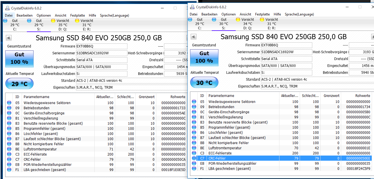 Edit: SSD ist eine Samsung SSD 840 EVO 250GB, laut Samsung Magician in gutem Zustand mit 3TB gesamt geschriebenen Daten.