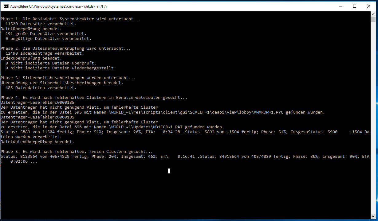 Mit dem Befehl "chkdsk x: /f /r" kam nun folgendes heraus: