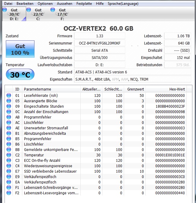 Allerdings müssen gute SMART Werte bei einer Vertex 2 ja nichts heißen, so weit ich weiß. Wenn der Fehler mit dem Controller zusammenhängt, dann steht davon nichts in den SMART Werten - und der Controller ist bei der Vertex 2 jetzt nicht gerade für seine Zuverlässigkeit bekannt...