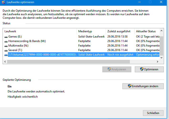 Allerdings: im Programm-Fenster werden meine Laufwerke/Partionen erkannt...per Laufwerkbuchstabe gelistet und dahinter, ob es eine HDD oder SSD ist...aber dann ist da noch ein Eintrag, dessen Laufwerkname sehr kryptisch und lang ist. Laufwerks-Typ SSD....Optimierung noch nie durchgeführt, aber nötig.