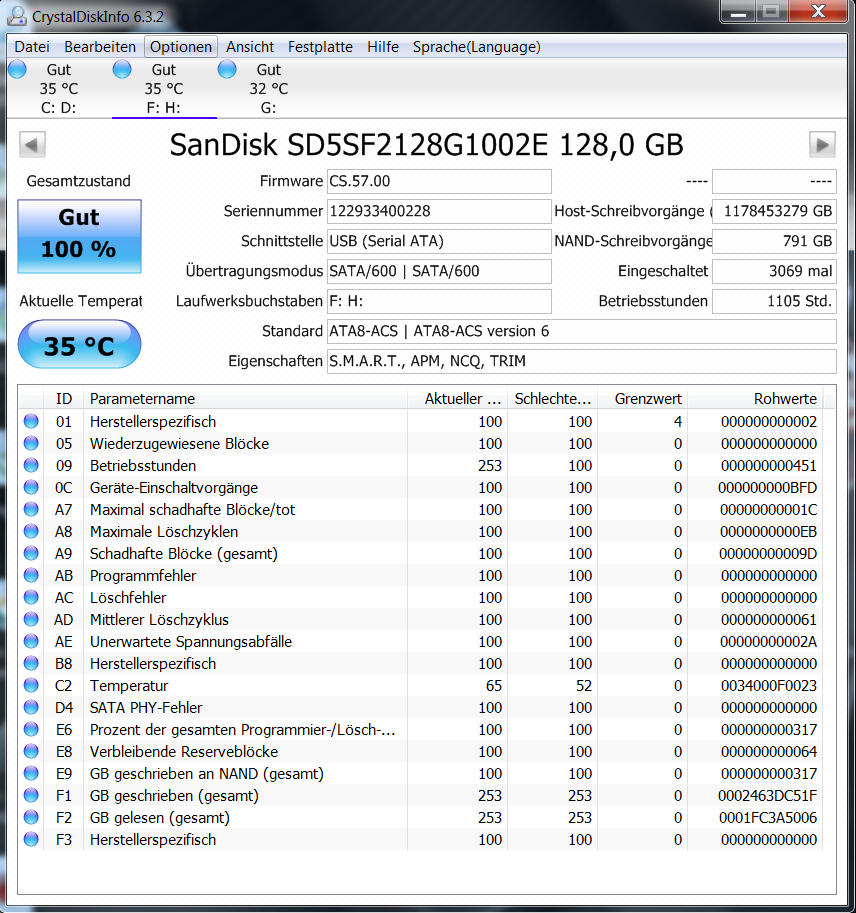 Hier mal die Smart-Werte (die alte SSD, wo noch Daten drauf sind):