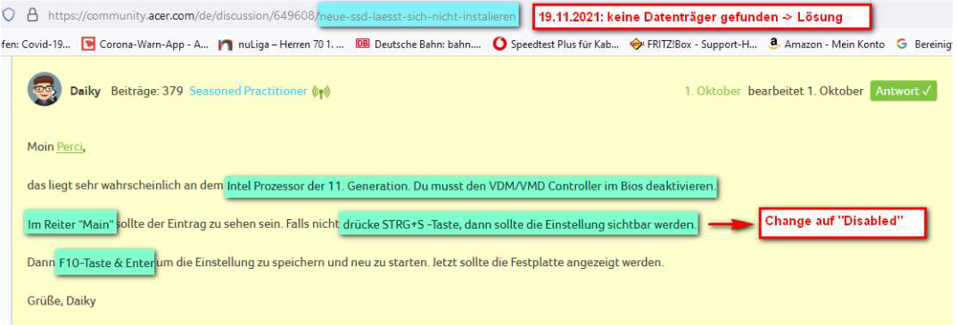 Zudem habe ich versucht eine andere SSD mit installierter WIN 10 Systempartition einzubauen -> wurde auch nicht erkannt ^^