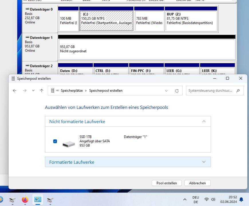 Dass dann die SSD nicht mehr im Arbeitsplatz erscheint ist ja logisch, da du alles darauf gelöscht hast.
