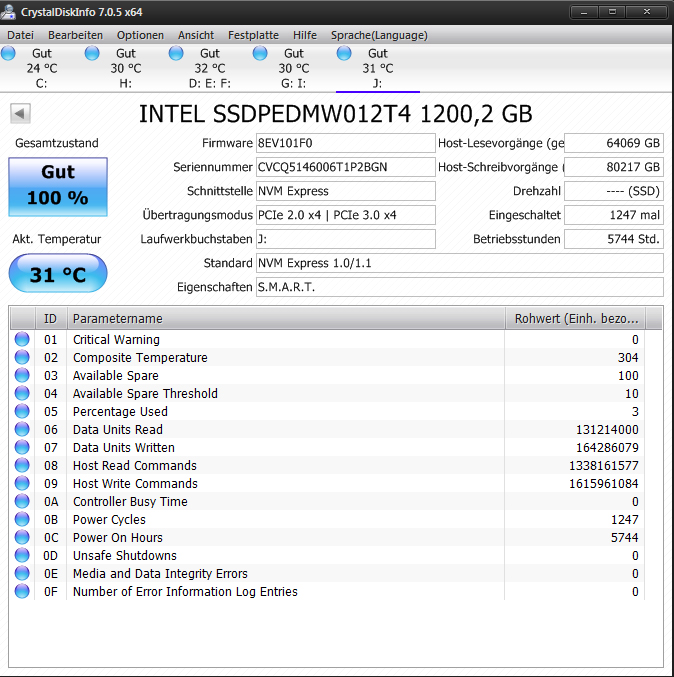 vor kurzer Zeit habe ich über Ebay eine PCIe SSD erworben (Intel 750er Serie mit 1,2 TB). Der Verkäufer fügte der Auktion u. a. ein Screenshot von (vermutlich) CrystalDiskInfo bei, in welchem u. a. die Lese- und Schreibvorgänge mit 914 GB respektive 311 GB dargestellt sind. In der Auktionsbeschreibung greift der Auktionator diesen Sachverhalt abermals auf und erklärt, wie gering dies in Relation zu den von Intel beworbenen Grenzwerten sei etc.