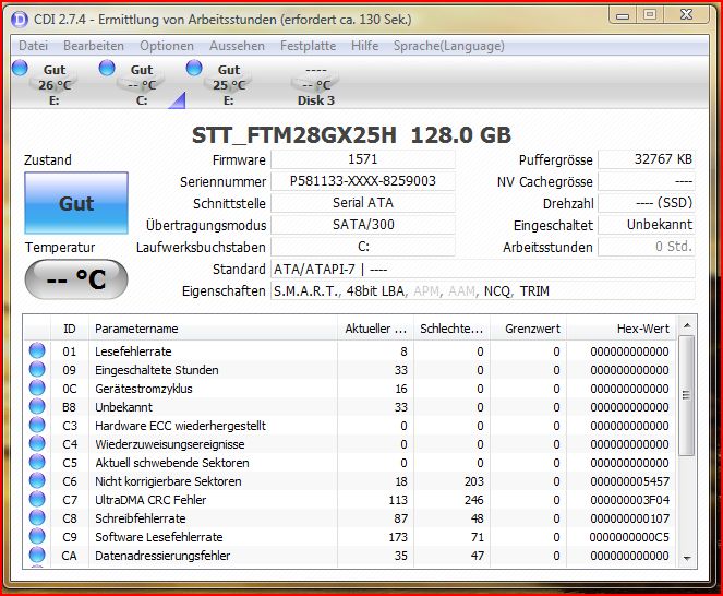 Hallo :) ich hab eine SSD von Supertalent mit 128GB ( FTM28GX25H ) mit der Firmware 1571.
