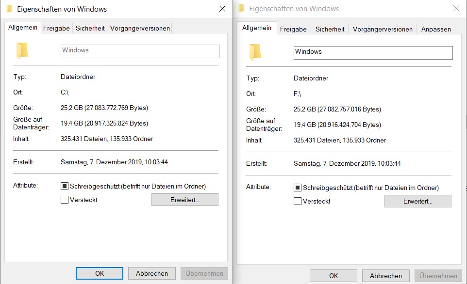 Die Windows Ordner sind jetzt zumindest gleich groß.