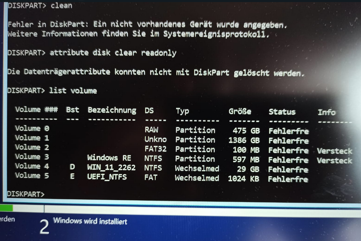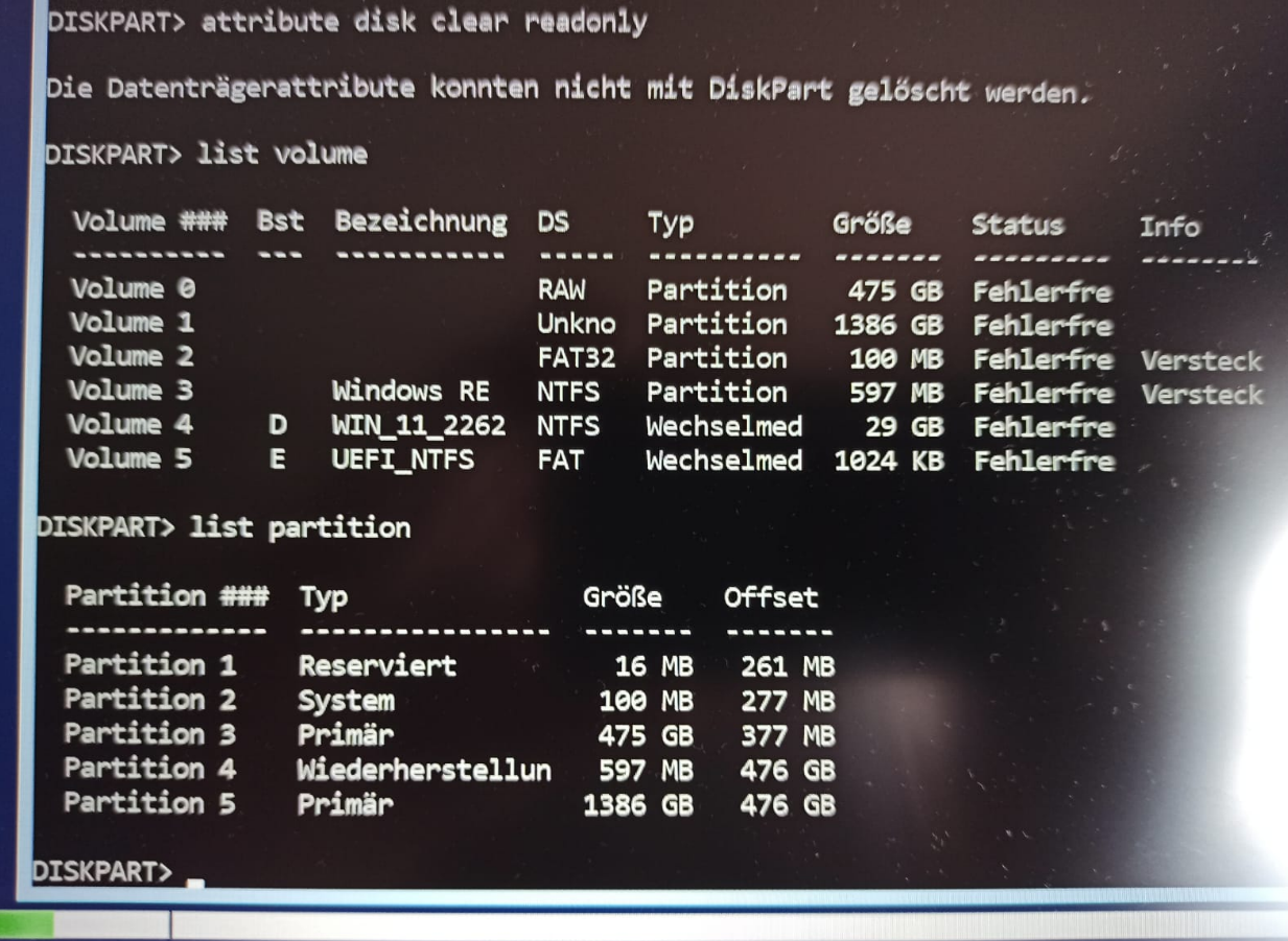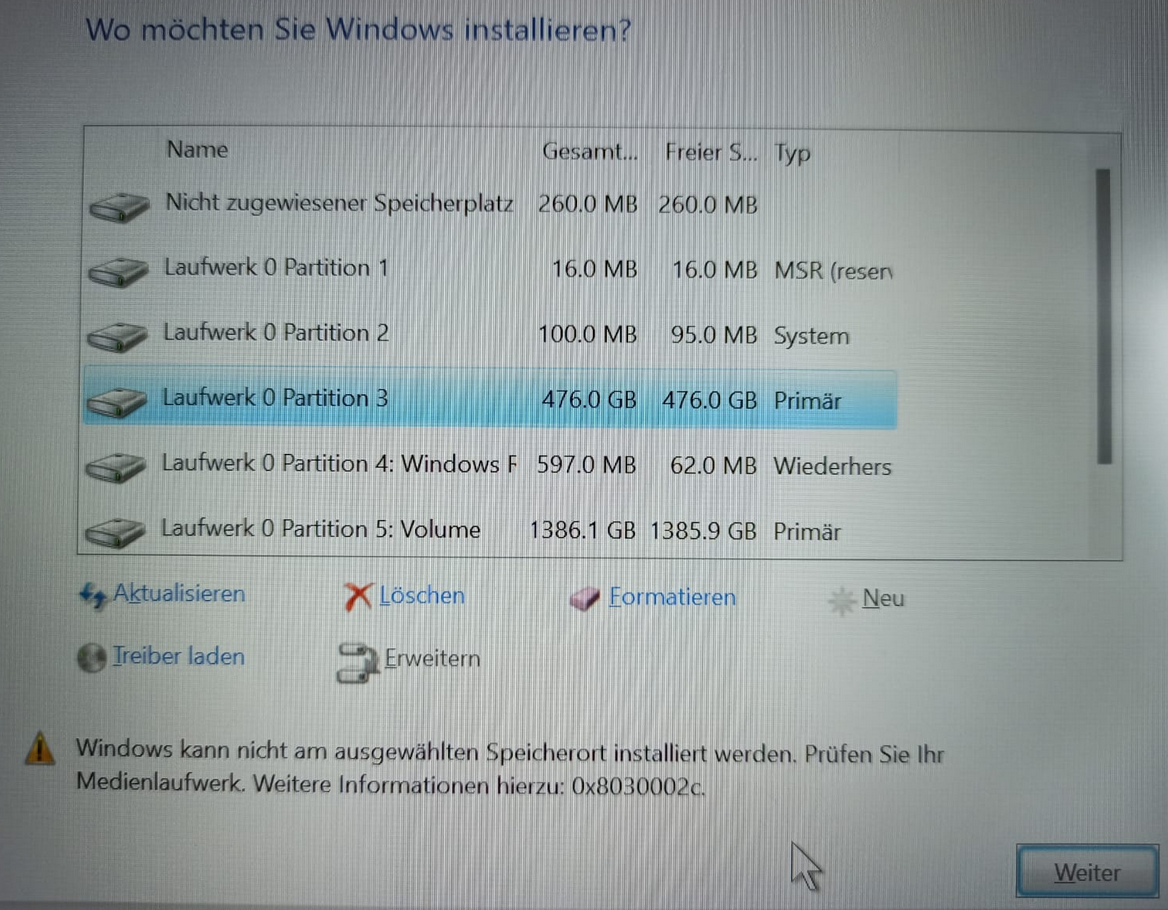 - Nun entstanden Probleme: einige der Partitionen ließen sich nicht löschen, und eine neue Installation wurde verweigert („Windows kann nicht am ausgewählten Speicherort installiert werden…“. Da ich einige der „alten“ Partitionen dabei doch gelöscht habe lässt sich jetzt das „alte“ Win11 Home nicht einmal starten.