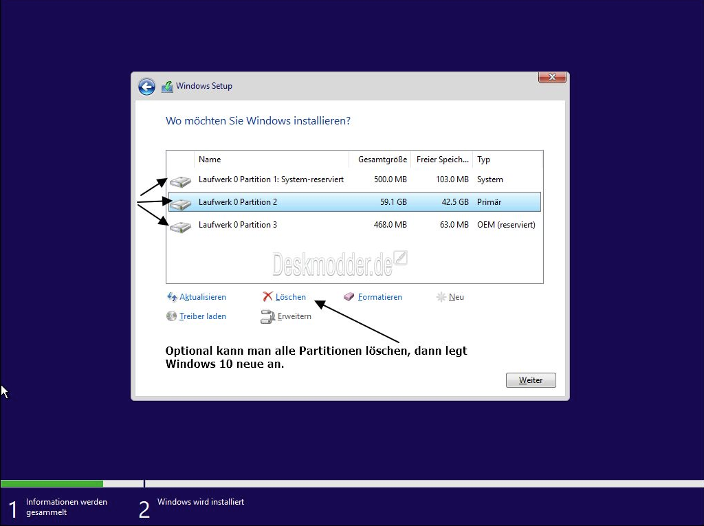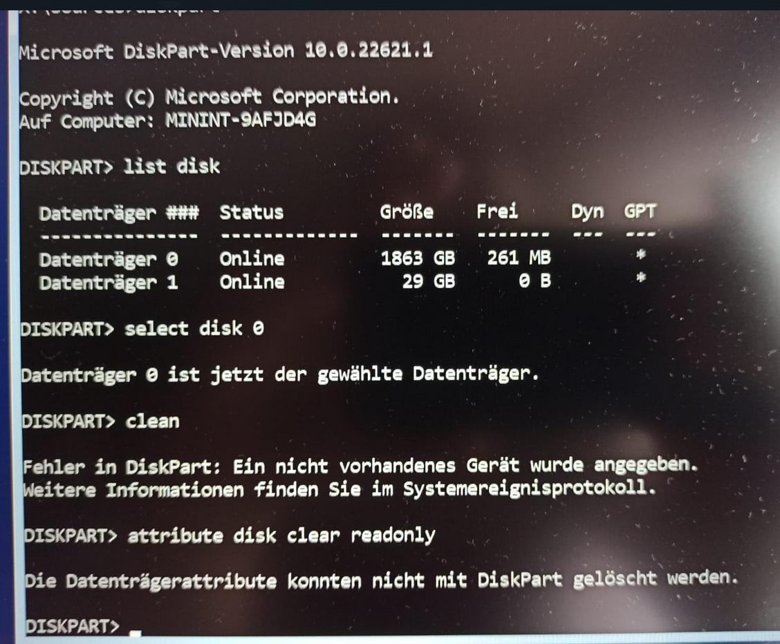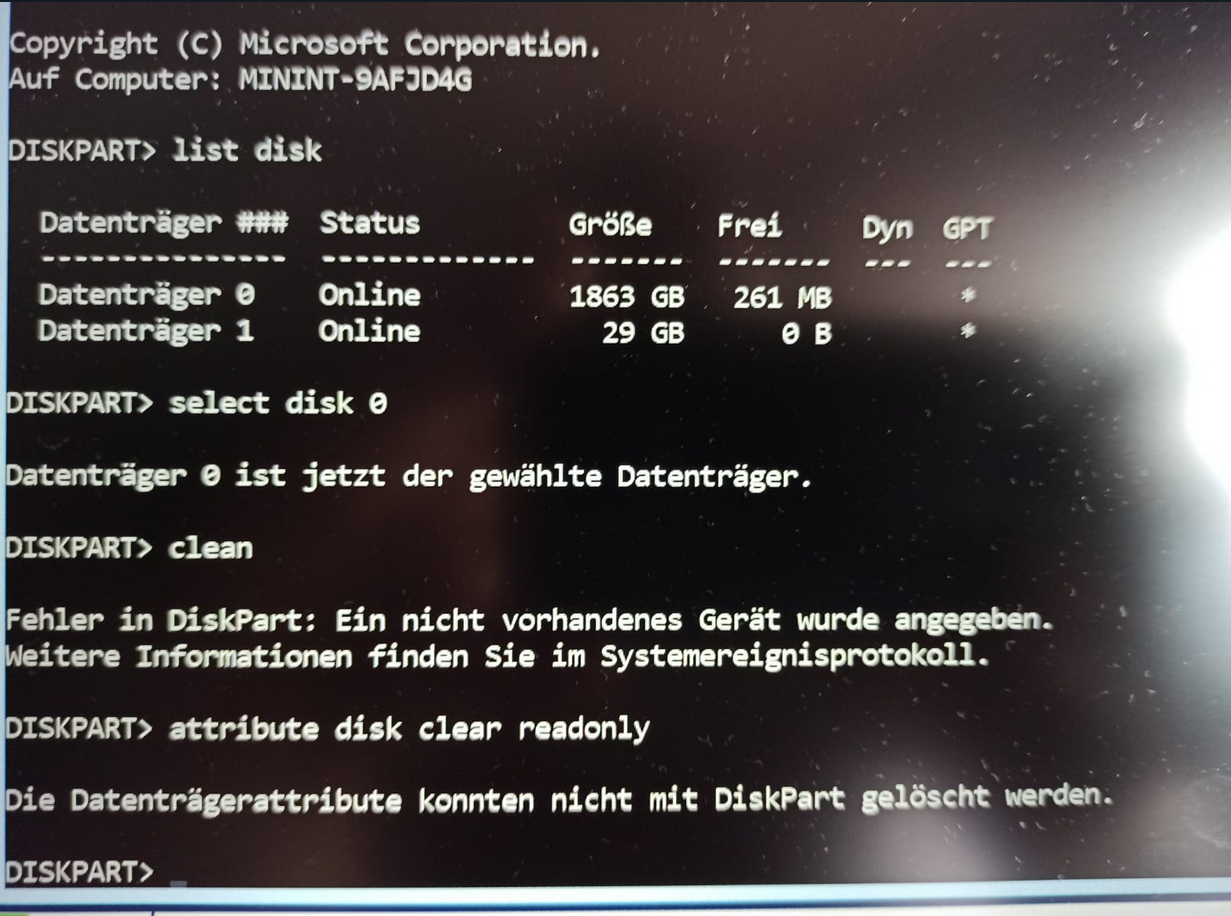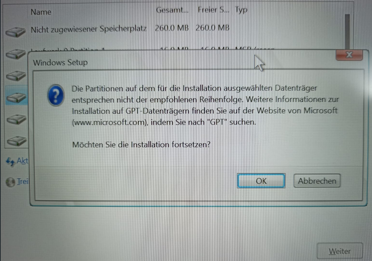 - Nun entstanden Probleme: einige der Partitionen ließen sich nicht löschen, und eine neue Installation wurde verweigert („Windows kann nicht am ausgewählten Speicherort installiert werden…“. Da ich einige der „alten“ Partitionen dabei doch gelöscht habe lässt sich jetzt das „alte“ Win11 Home nicht einmal starten.