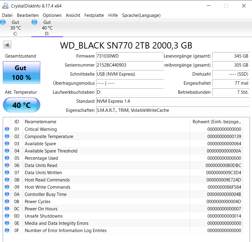 - Die 500GB SSD gegen eine 2TB SSD ausgetauscht. (zuvor die kleine SSD auf die neue SSD geklont)
