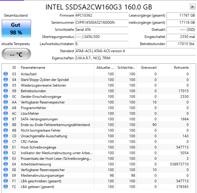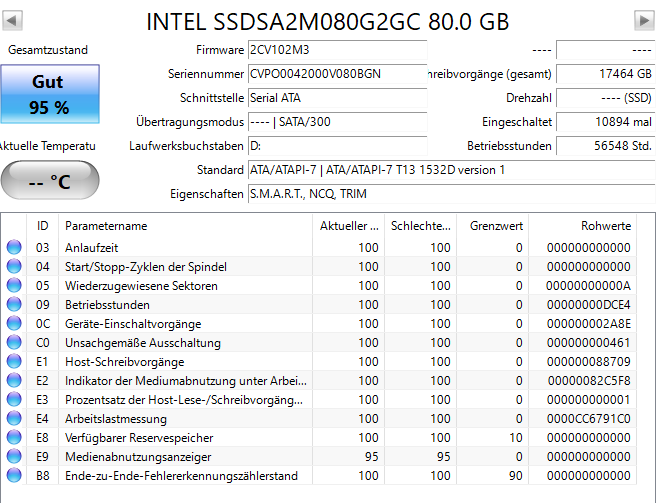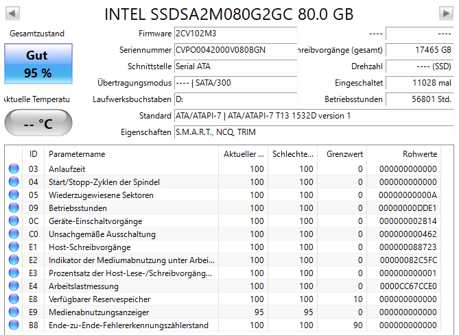 Die Diagnose von Crystaldisk zeigt (nach meiner unfachmännischen Interpretation) keine Auffälligkeiten (siehe unten), obwohl die Platte schon rund 12 Jahre auf dem Buckel hat; es war meine erste SSD, die ihren Dienst bisher stets ordentlich getan hat.