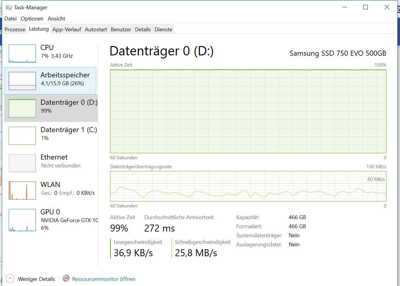 Welcher Prozess steht denn ganz oben wenn du im Task-Manager im Reiter "Prozesse" nach Datenträgerauslastung absteigend sortierst?