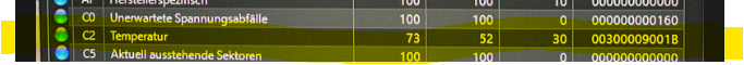 Die Werte sind auf 100 normalisiert. Aktuelle Temperatur ist 27 °C, die höchste jemals gemessene 48 °C. So eine SATA-SSD erhitzt sich auch nicht wirklich stark.SuperHeinz schrieb: