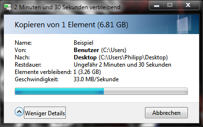 Ich war ziemlich erschrocken - gegen den Schluss des Kopiervorgangs transferierte sie noch mit 27.5 MB/s. Am Anfang ist es ziemlich schnell, wird aber kontinuierlich langsamer.
