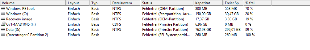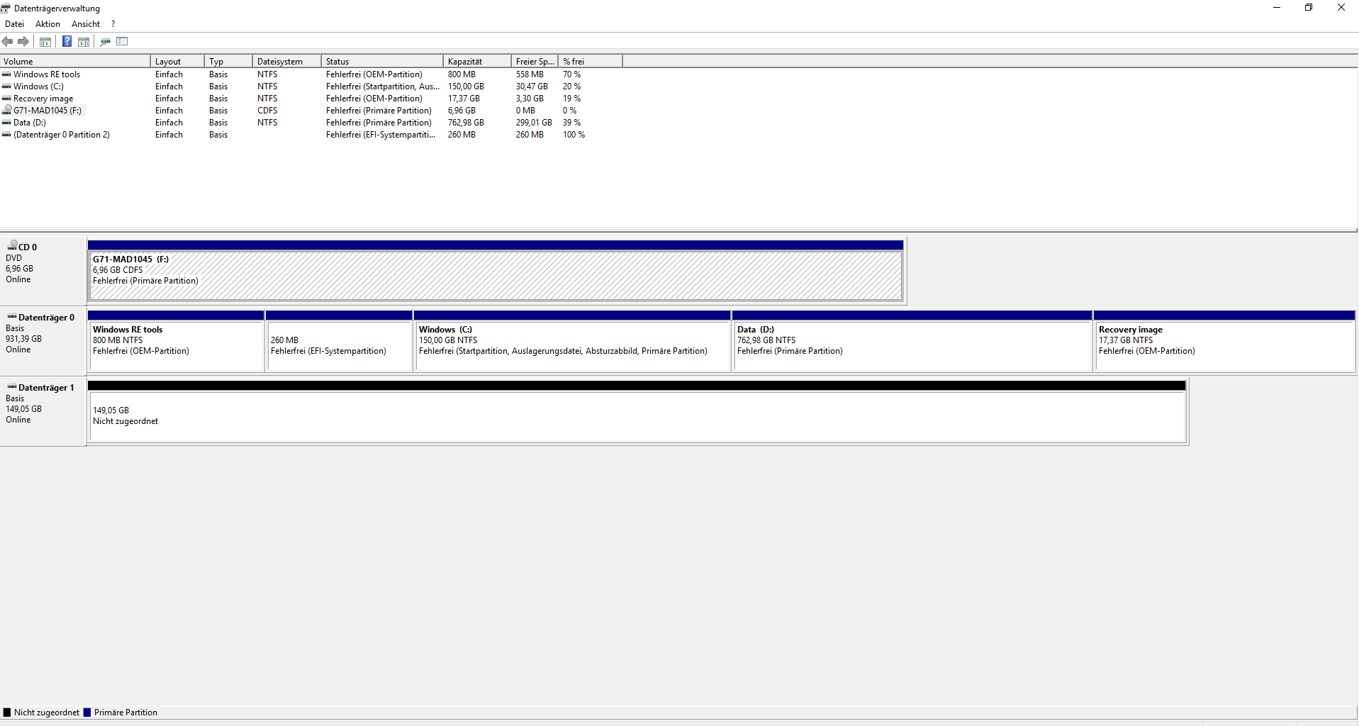 Du meinst du "neues übergreifendes Volume" ? Falls ja, das ist grau. :/Schatho schrieb:zeig nochmal ein Bild der Datenträgerverwaltung.