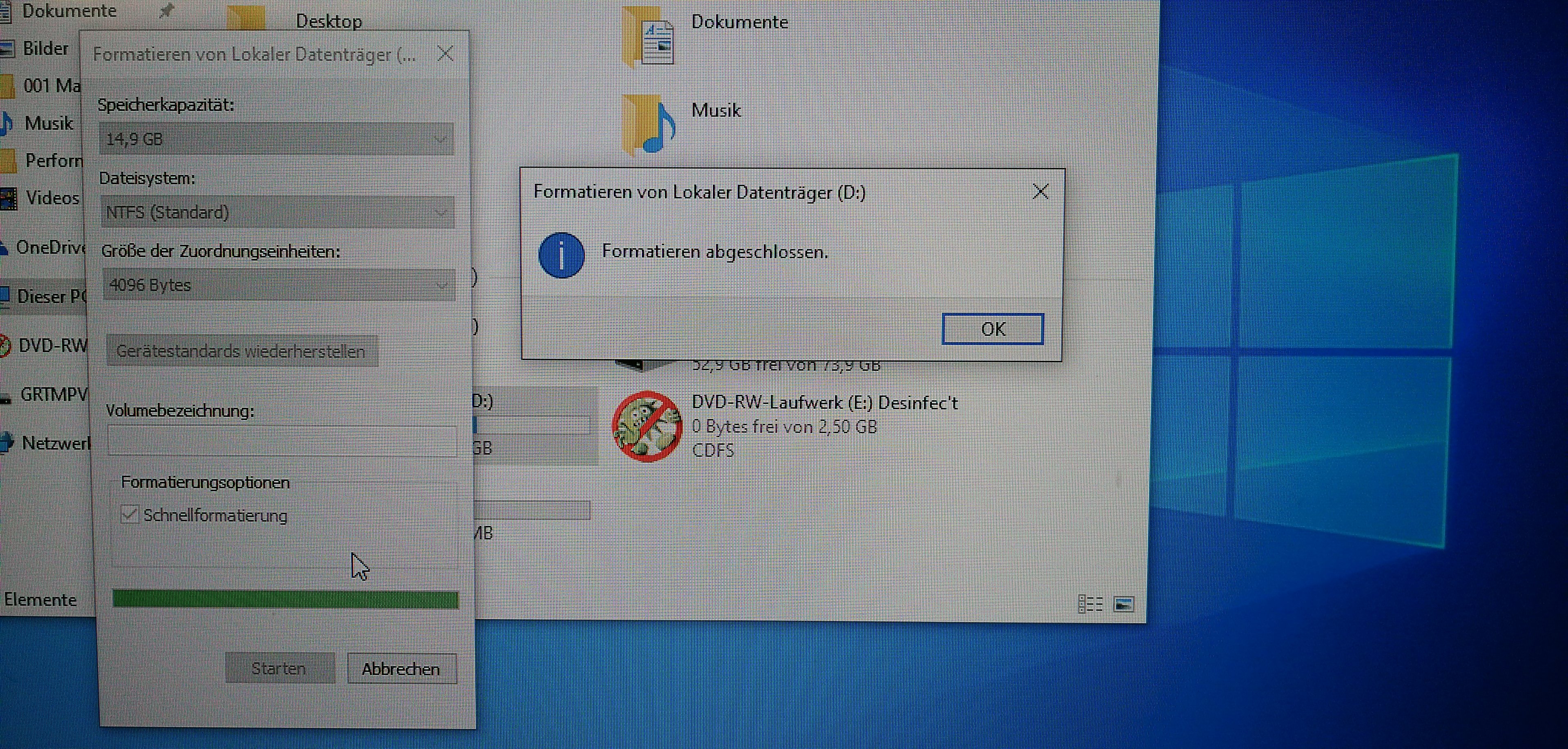 Genauso hat es keinen Erfolg, Win XP oder 10 über USB Stick zu starten, um die Platte zu formatieren.