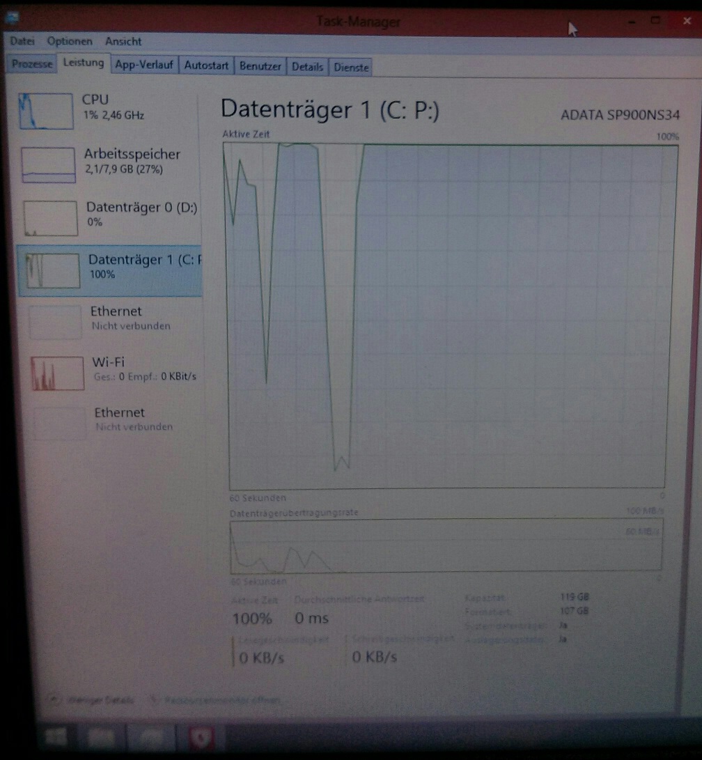 Gestern Abend dann das gleiche, nach 10 Min Laufzeit hängt sich Windows wieder komplett auf. Jedoch laufen die Programme die nur RAM brauchen (z.B. Flash Video) weiter während alle Fenster melden "prozess reagiert nicht mehr". SSD wurde wieder nicht erkannt (HDD schon wie am Tag zuvor). Nach einer Abkühlzeit von 15 Min konnte ich schnell den Taskmanager starten bevor er sich wieder aufhängt. Der Taskmanager wurde auch noch nach dem Aufhängen aktualisiert.