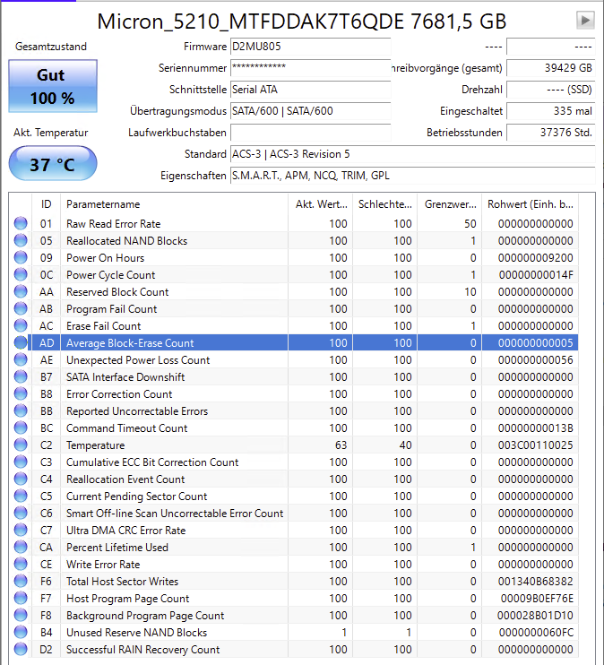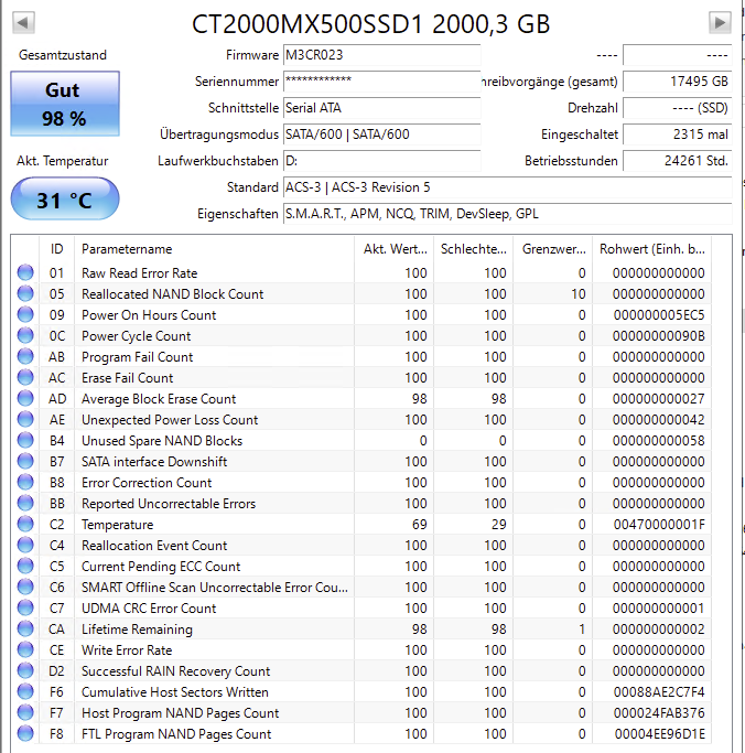 Meine eine mit angeblich 202349 GB Schreibvorgaenge und verbleibende Lebenszeit 184.