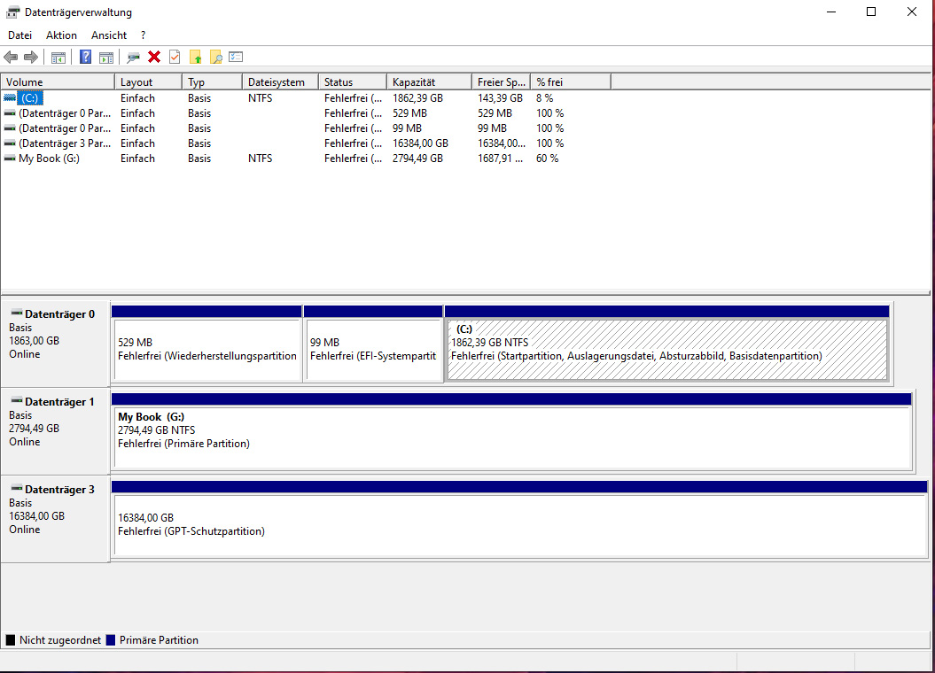 Der Datenträger 3 ist die Platte, wobei die Größenanzeige unsinn ist. Wisst ihr woran es liegt, dass ich die Platte nicht sehe? Es ist ja auch kein Buchstabe zugewiesen. Die Platte darf auf keinen Fall formatiert werden.
