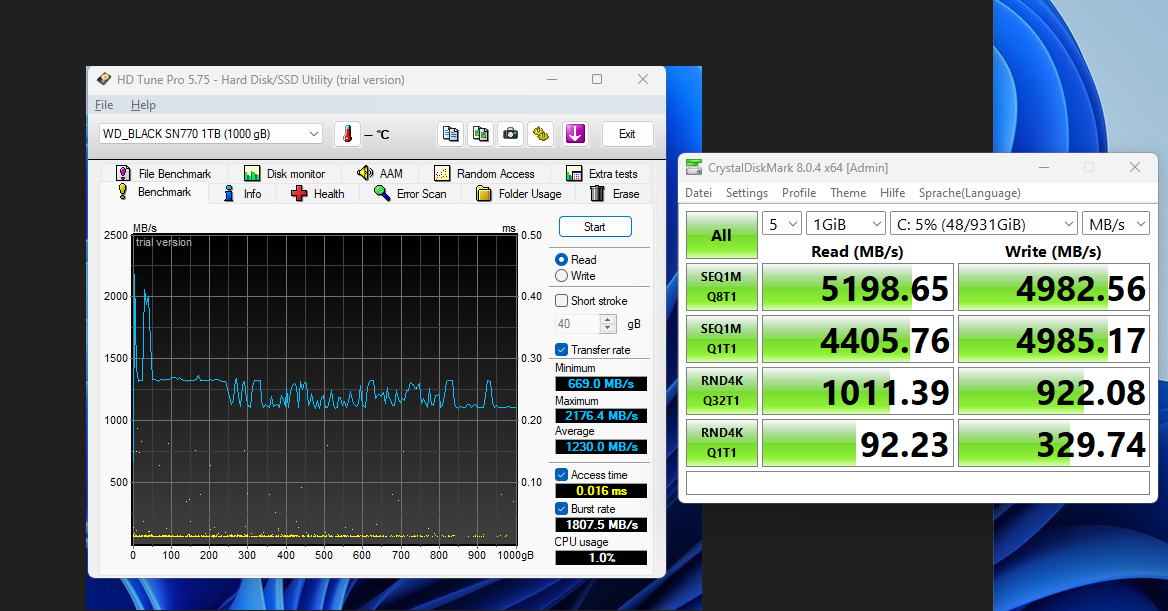 Auch andere Tools zeigen identische Werte zu Crystal Disk Mark an. Nur HD Tune hat komplett niedrigere Werte.