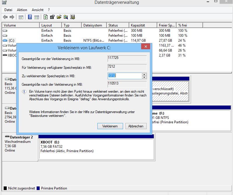 ich habe eine 124 GB SSD im Laptop der eine große 114 GB Partition hat. Ich habe noch ca. 30 GB frei und die möchte ich in eine zweite Partition geben, wozu ich "C" kleiner machen muss. Mit dem Windowseigenem Tool "Festplattenformationen erstellen und formatieren" wird mir immer nur angezeigt, dass ich nur 7 GB freigeben kann.