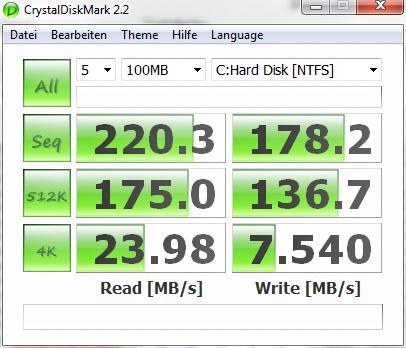 Dann habe ich festgestellt, dass die (Benchmark-)Performance auf dem Desktop (Win7 x64) deutlich besser ist, als auf dem Notebook (Vista x86). Selbst die Firmware beider SSDs ist aktuell / identisch. Zum Vergleich mal die beiden Screenshots im Anhang.