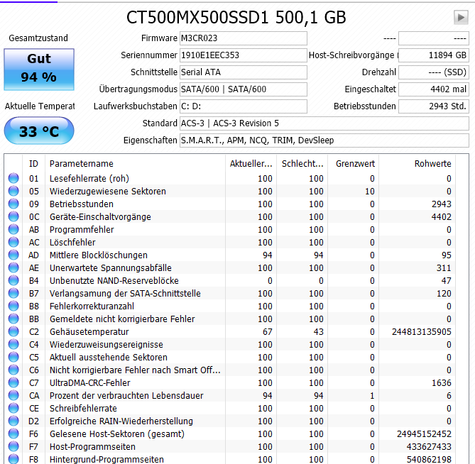 Zur Info: Ich konnte bis dato keinen Datenverlust oder nicht funktionierende Programme feststellen. Auch ist mit CrystallDiskInfo (siehe Anhang) keine Auffälligkeit angezeigt worden.