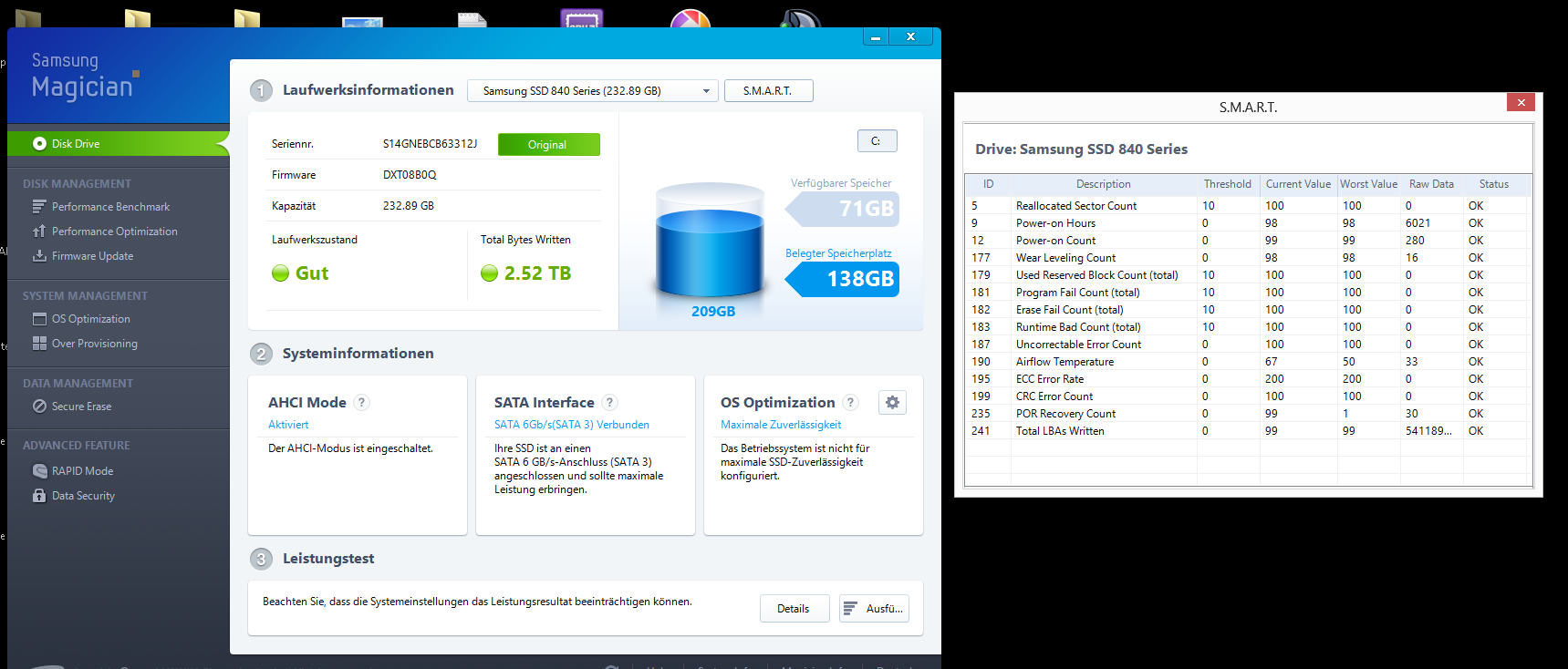 Wo stand mal "ausgezeichnet" und jetzt nur noch "gut"? Poste bitte mal den Screen von CrystalDiskInfo, ziehe aber bitte das Fenster soweit auf, dass alle Attribute und auch die Hex-Werte bzw. Rohwerte vollständig sichtbar sind. Dann sieht man, ob die gealtert ist, ein Problem vorliegt oder bei der Übersetzung eines Programms einfach jemand die Begriffe getauscht hat, weil "ausgezeichnet" zu lang war.lynx007 schrieb:wäre sowieso mein zweite habe eine samusung 840 nicht pro, und ich hatte halt immer wieder abstürze in win8 und auch scheint die platte sehr schnell zu altern obeohl ich kaum daten hin und her bewegt habe. von ursprünglich "ausgezeichnet" ist sie nur noch "gut",