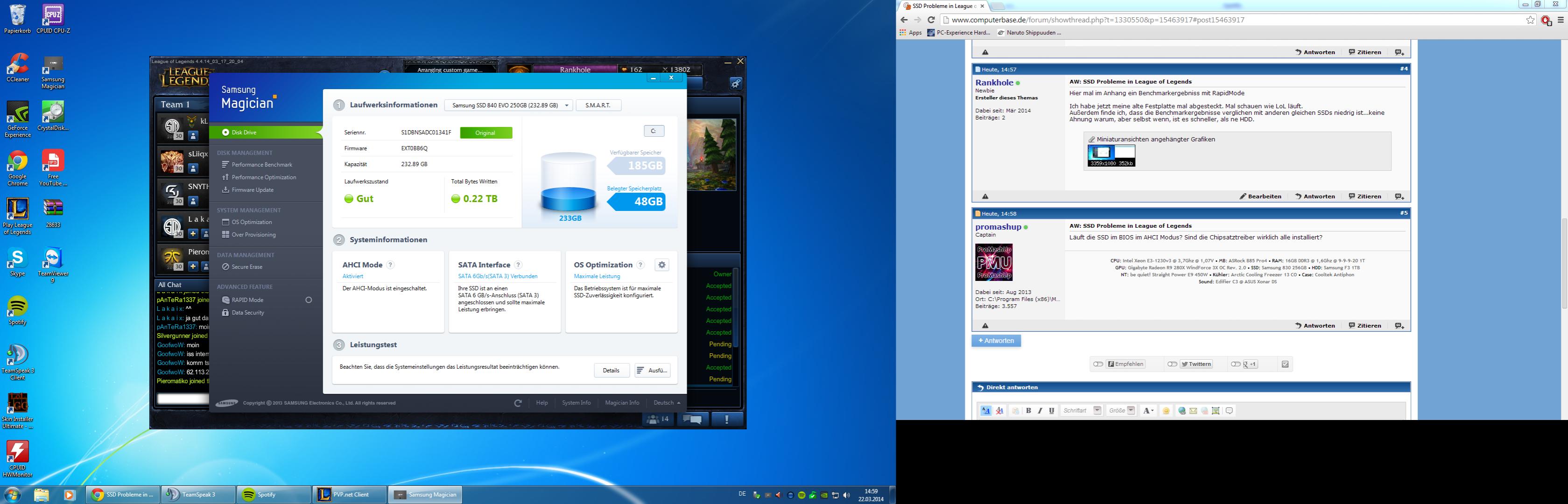 Zudem kommt noch, das LoL von der Geschwindigkeit der SSD gar nicht zu profitieren scheint - im Gegenteil. Die Ladezeiten sind sogar leicht langsamer als von meiner alten HDD. Das kann aber nicht sein, ich habe meine SSD überprüft und sie läuft mit RapidMode, alles läuft gut und flüssig, Battlefield 4 läd sogar ungefähr genauso schnell wie LoL, was vorher 2-3 Minuten dauerte.