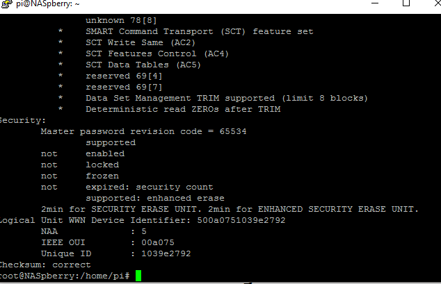 Poste mal die Ausgaben von sudo hdparm -I /dev/sdx (x durch den korrekten Buchstaben ersetzen), dazu musst Du sie aber an einen Linux Rechner hängen oder ein Live Linux booten. Wichtig ist der Teil der nach Security kommt.