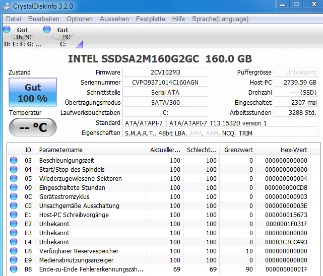 Hallo zusammen.Win 7 meldet mir seit 2 tagen Smart Fehler der in meinem system aufgeführten ssd.Es ist dieser Ende-zu-Ende Fehlererkennungszähler.Der geht halt immer weiter in die knie und wollte mal wissen wie Ausagekräftig diese Fehlermeldung ist und was genau der für eine Bedeutung hat für die SSD.Defekte Sektoren hat die SSD noch keine mit hdtune und Chkdisk geprüft.Komischerweise kann ich aber schon kein Backup also systemabbild mehr machen weil windows ne fehlermeldung raushaut von wegen e/a Fehler oder so.Hab aber z.g noch ein älteres backup und ist auch nur win 7 drauf auf der SSD.Bis jetzt auch noch keine Probs beim booten oder Abstürze.