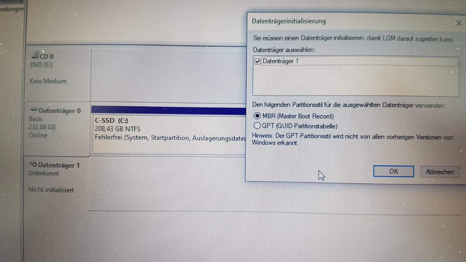 Habt ihr mir da einen Tipp? Sollte ich aus der Partition eine MBR oder GPT machen?