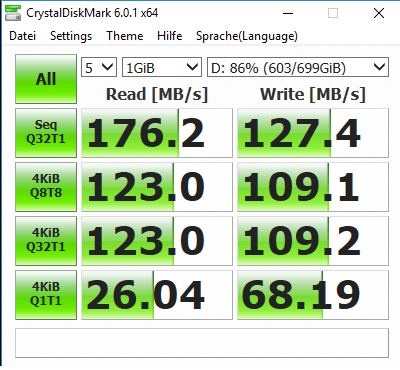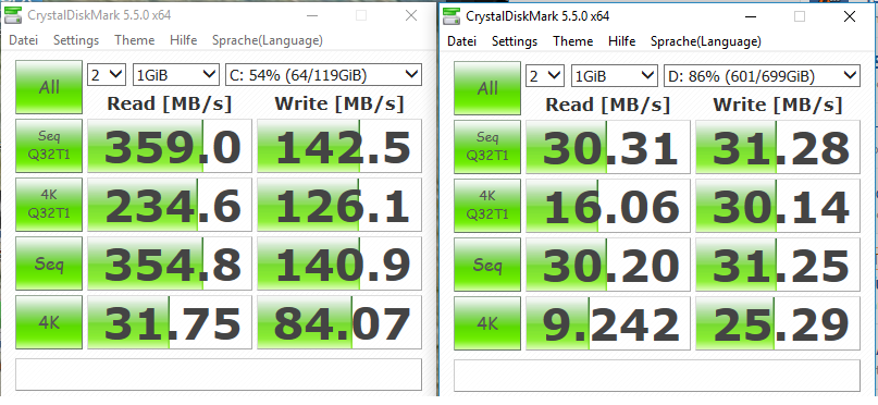 Nur was kann das sein? 359MB/s lesen und 142MB/s schreiben bei c: und 30MB/s lesen und 31MB/s schreibend bei d: