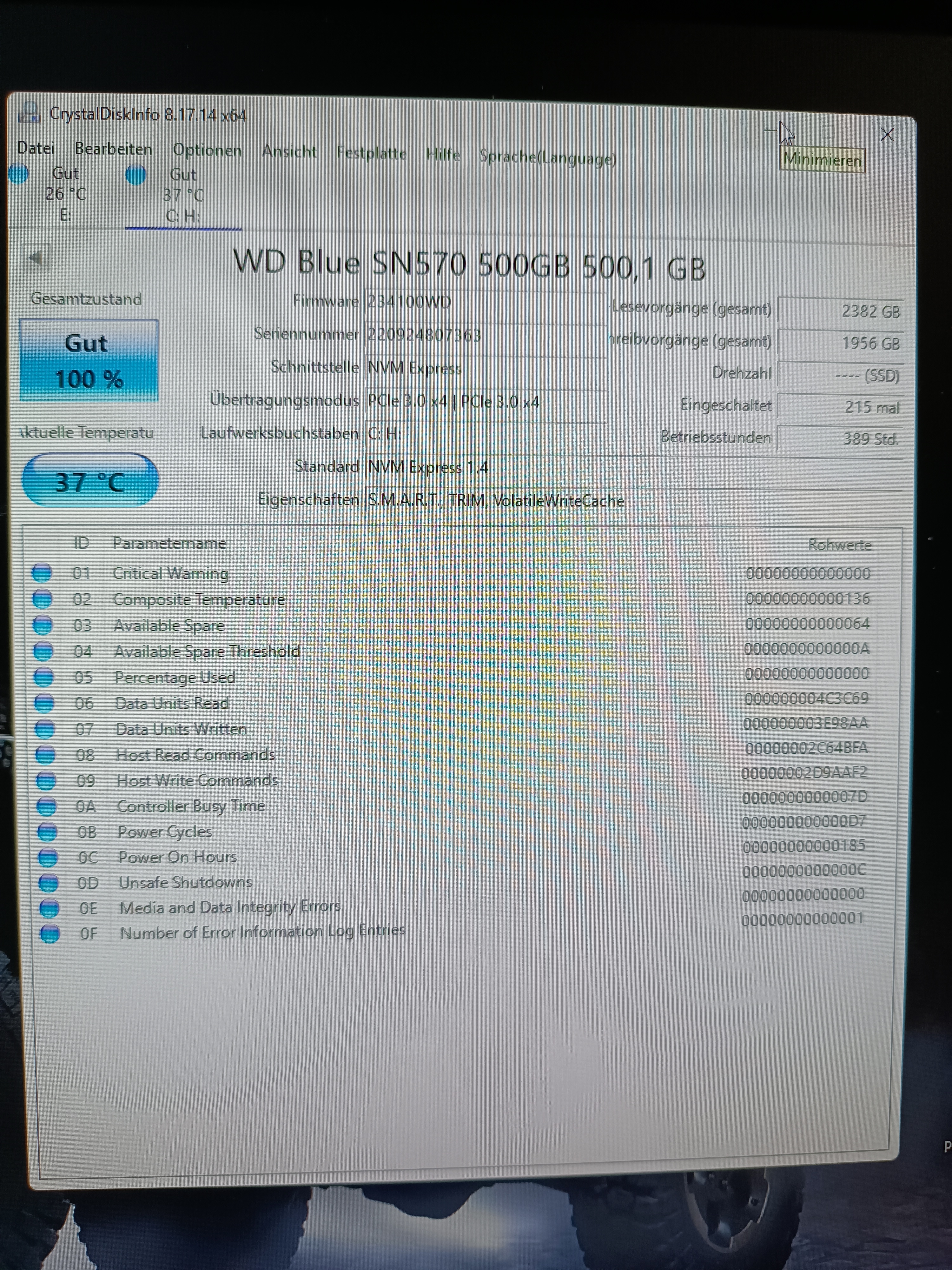 Rechner wieder aus, SATA Kabel von der SSD raus in den anderen Port rein und plötzlich ging alles normal. Alle Daten auf SSD vorhanden und Download vom Spiel ging auch.