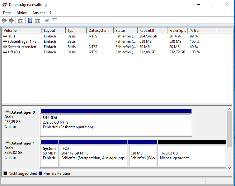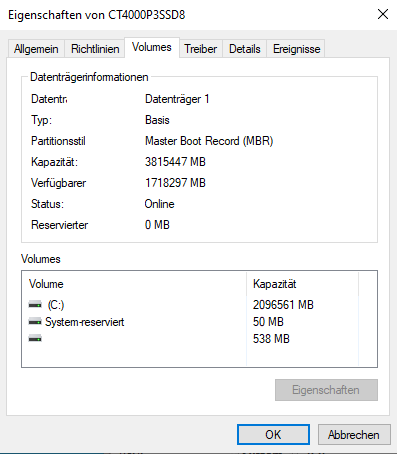 ich habe mir eine crucial p3 4Tb SSD zugelegt. Weil die mit Abstand die schnellste in meinem PC ist, hab ich darauf Windows installiert. Jetzt ist die auf 2 TB beschränkt. Auf die restlichen 1,6 TB kann ich nicht zugreifen und irgendwie auch nicht in der Datenträgerverwaltung zuweisen(alle Optionen sind ausgegraut und das 2 TB Volumen kann ich nicht weiter vergrößern) . Hat da jemand eine Idee ?