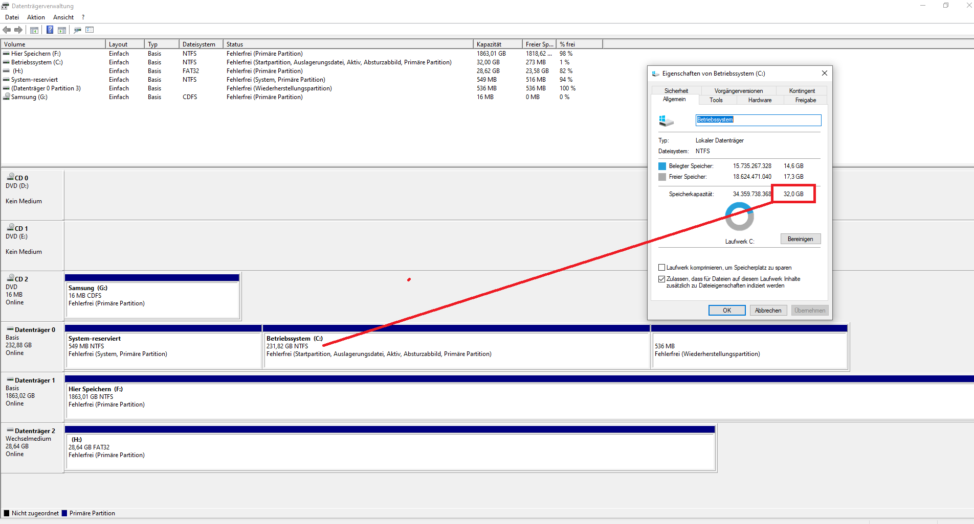 - In den Explorer Eigenschaften der Festplatte wird diese ebenfalls nur mit 32 GB angegeben
