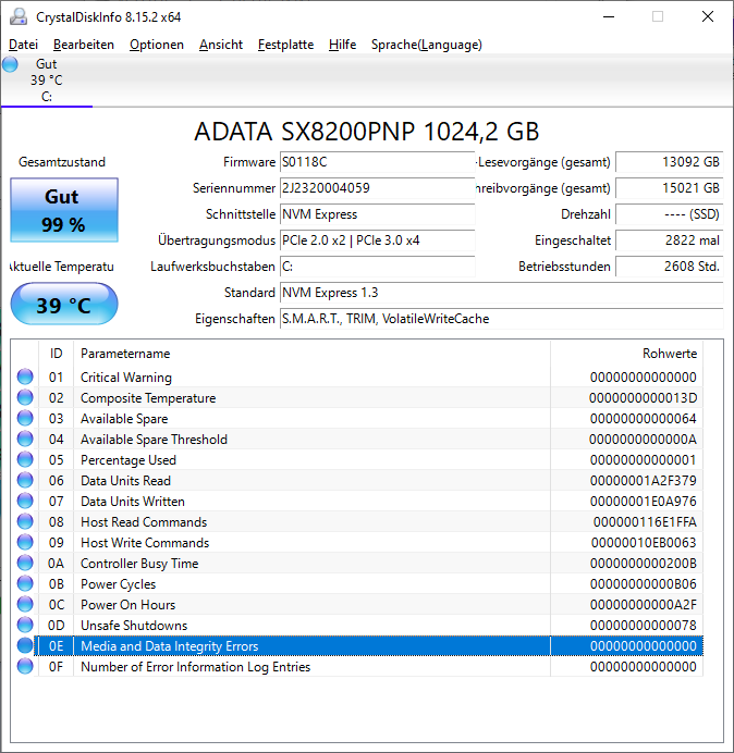 Ich habe mit CrystalDiskInfo mal die SSD überprüft: scheint ok.