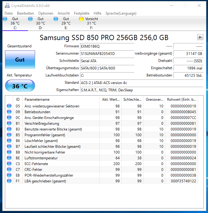 wenn ein Programm bei fehlerhaften Sektoren von einer Plattenoberfläche spricht ist das schon mal ein Zeichen dafür es mit SSD nicht so wirklich umgehen kann. Ersetzte Sektoren sind bei SSD nicht unüblich allerdings sollte man der Ursache auf den Grund gehen. Dazu braucht man die SMART-Werte von CDI da dies auch die Lebensdauer von Samsung SSD korrekt anzeigt (in aktuellen Versionen).