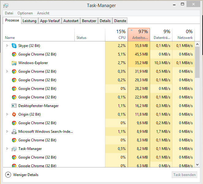 Okay, danke. Kann ja alles wieder rückgängig machen, aber ich glaube nicht das es daran liegt. Ich habe jetzt wieder ca. eine Stunde normal gezockt. (ram bei ca. 5GB) dann plötzlich ist der ram auf 99% und 2 min später die SSD auf 100%. das liegt bestimmt an der auslagerungsdatei.