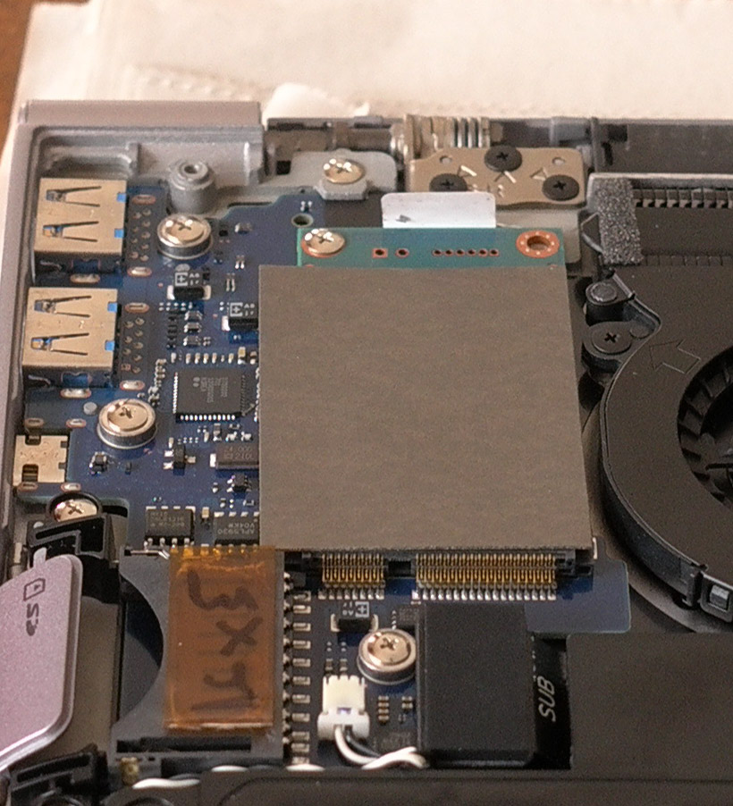 Das SSD Laufwerk, das so klein ist, dass ich es als solches kaum erkannt habe, hat die Bezeichnung SANDisk 54-50-02036-Rev 1 (formal 128 GB). Es hat 8+18 Kontakte, die wie Füße nach unten stehen.