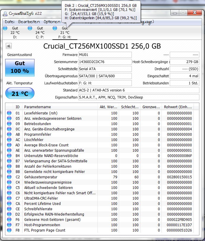 Jedenfalls ist mein Problem folgendes: Meine Herzensdame hat von mir zu Weihnachten eine SSD bekommen (Crucial MX100, 256 GB). Da sie aber ihr Windows nicht neu aufgesetzt haben wollte stand ein Umzug auf die SSD an - kein großes Problem denke ich mir. Acronis dann nach gut einer Stunde dazu bekommen vom USB-Stick zu booten und dann die alte Disk (1 TB, 2 Partitionen ohne MBR) kopiert. Dabei hab beide Partitionen kopiert und auf die SSD klonen lassen.