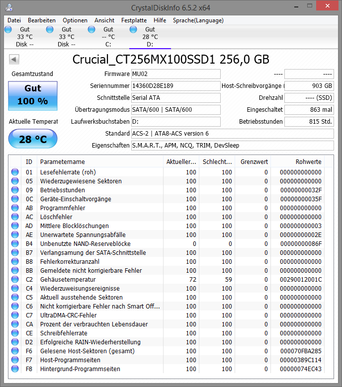 Poste bitte mal den Screen von CrystalDiskInfo (die Portable Standard Edition reicht und ist frei von Werbung, einfach dem Link folgen, die zip speichern und irgendwohin komplett entpacken, dann DiskInfo.exe dort starten), ziehe aber bitte das Fenster soweit auf, dass alle Attribute und auch die Rohwerte vollständig sichtbar sind.