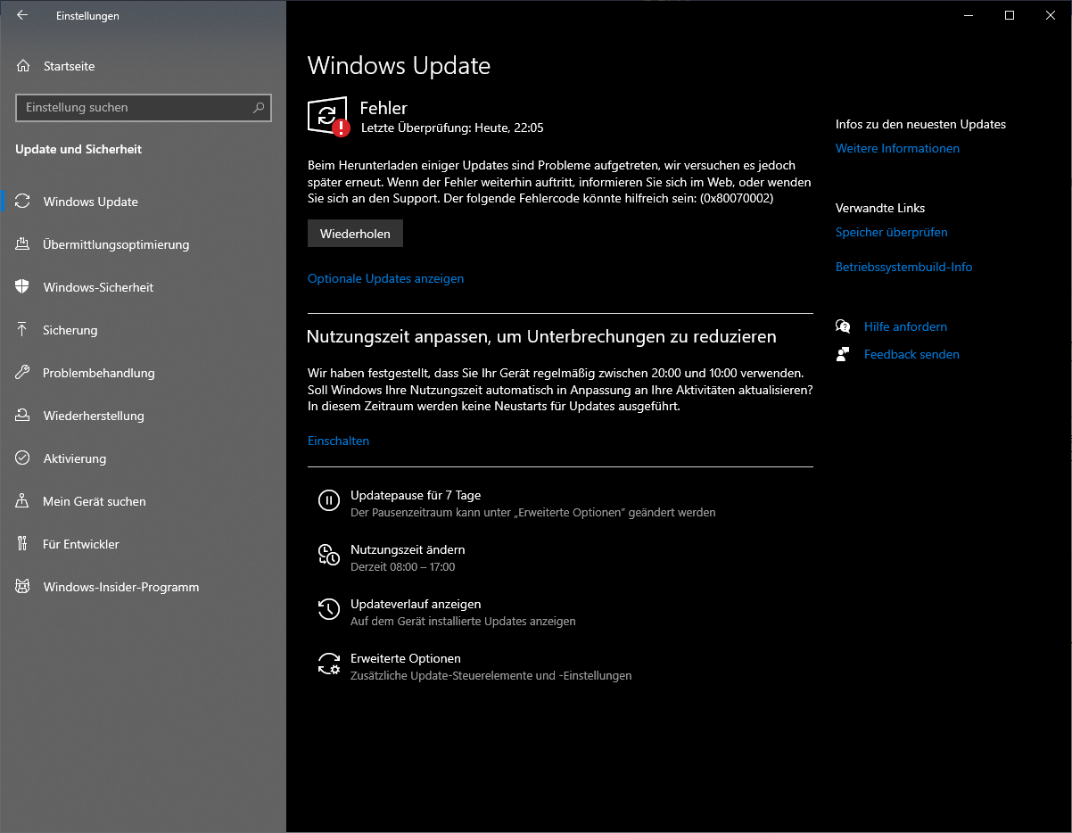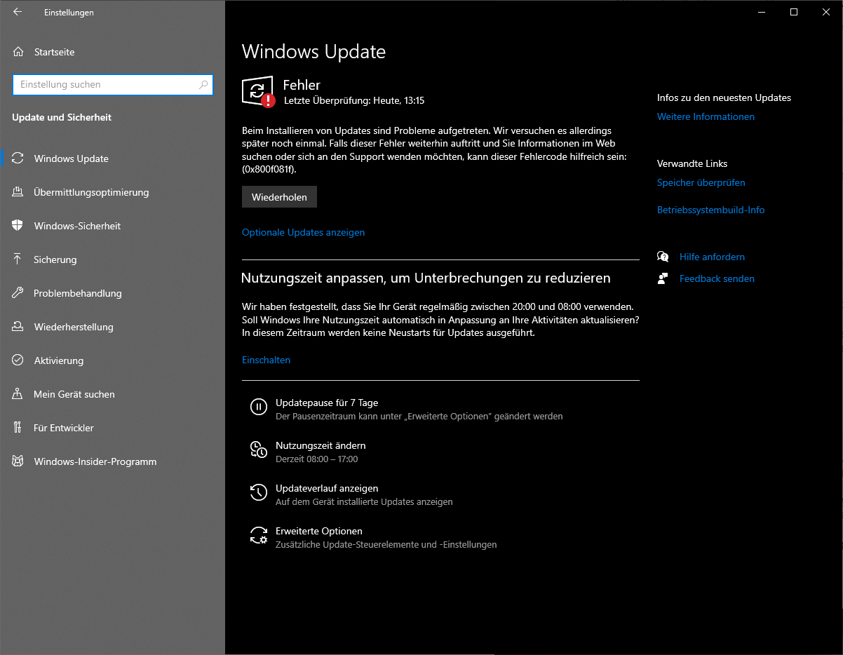 Es ist auch nicht außergewöhnlich, wenn Windows mehrere Neustarts braucht, um alles einzurichten. Ein Windows 10 PC, der sich in meinem Microsoft Konto anmeldet, hat das letzte Featureupdate nachts gemacht und die Leute, bei dem er steht, haben gar nichts davon gewusst. Als ich sie danach ansprach, meinten sie nur, dass der PC von sich aus anging und nach einer Stunde wieder aus war.
