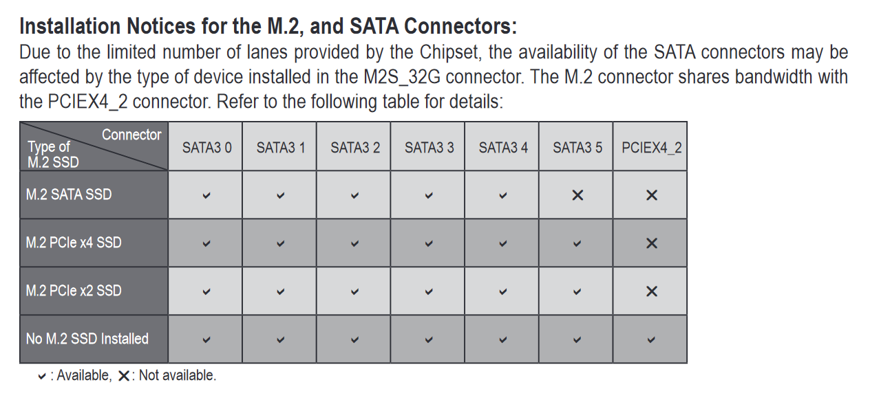 * The PCIEX4_2 slot shares bandwidth with the M.2 connector. When the M.2 connector is populated, the PCIEX4_2 slot becomes unavailable.