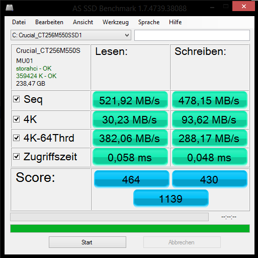 Hallo, bin neu hier und würde gerne wissen ob meine neue SSD die Werte erreicht hat die sie haben sollte, kenne mich da nicht so gut aus. Wollte erste eine Samsung EVO kaufen aber da hieß es das der TLC Speicher nicht lange hält deshalb habe ich eine M550 gekauft die einen MLC Speicher hat und hoffe nun das die gut genug ist.