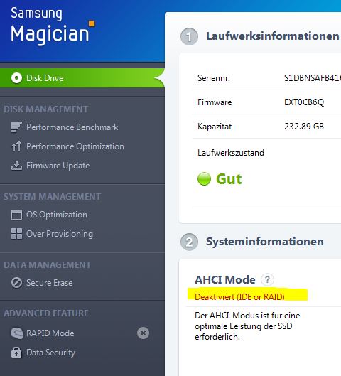 Zuvor habe ich mich im Netz durchgelesen, dass ich zuerst im Bios von IDE auf AHCI umstellen muß.