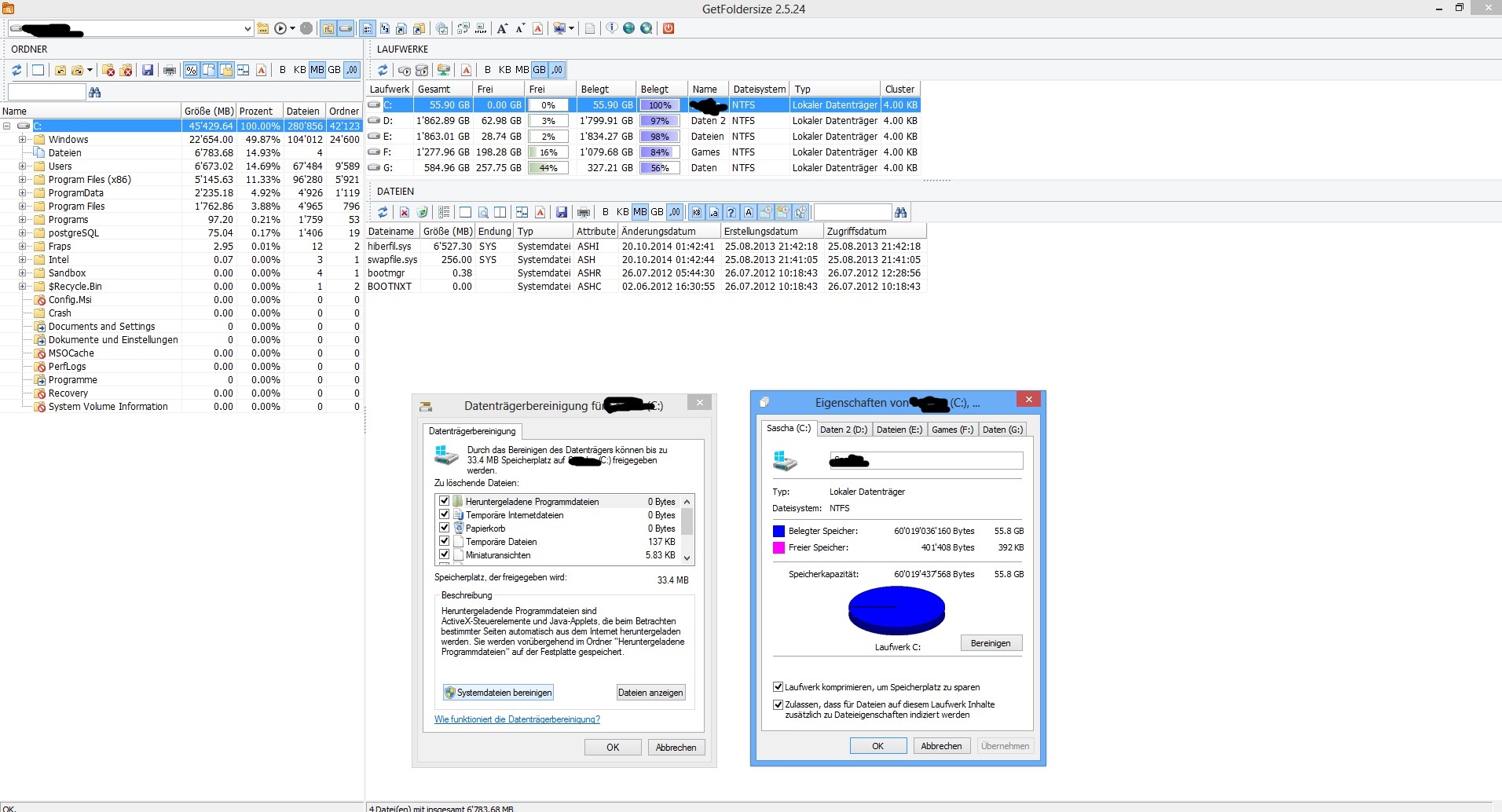 Vorgeschichte; Win8 64b ist ca. 1 Jahr alt +/-, und seit ca. 2 Wochen hab ich auf meiner ( eher relativen kleinen SSD 60gb ) kein Space mehr, bzw. Windows meldete sie wäre voll 0 byte war frei - hab dann ca. 10gb daten gelöscht! (problem bei 0byte... nix ladet mehr^^)