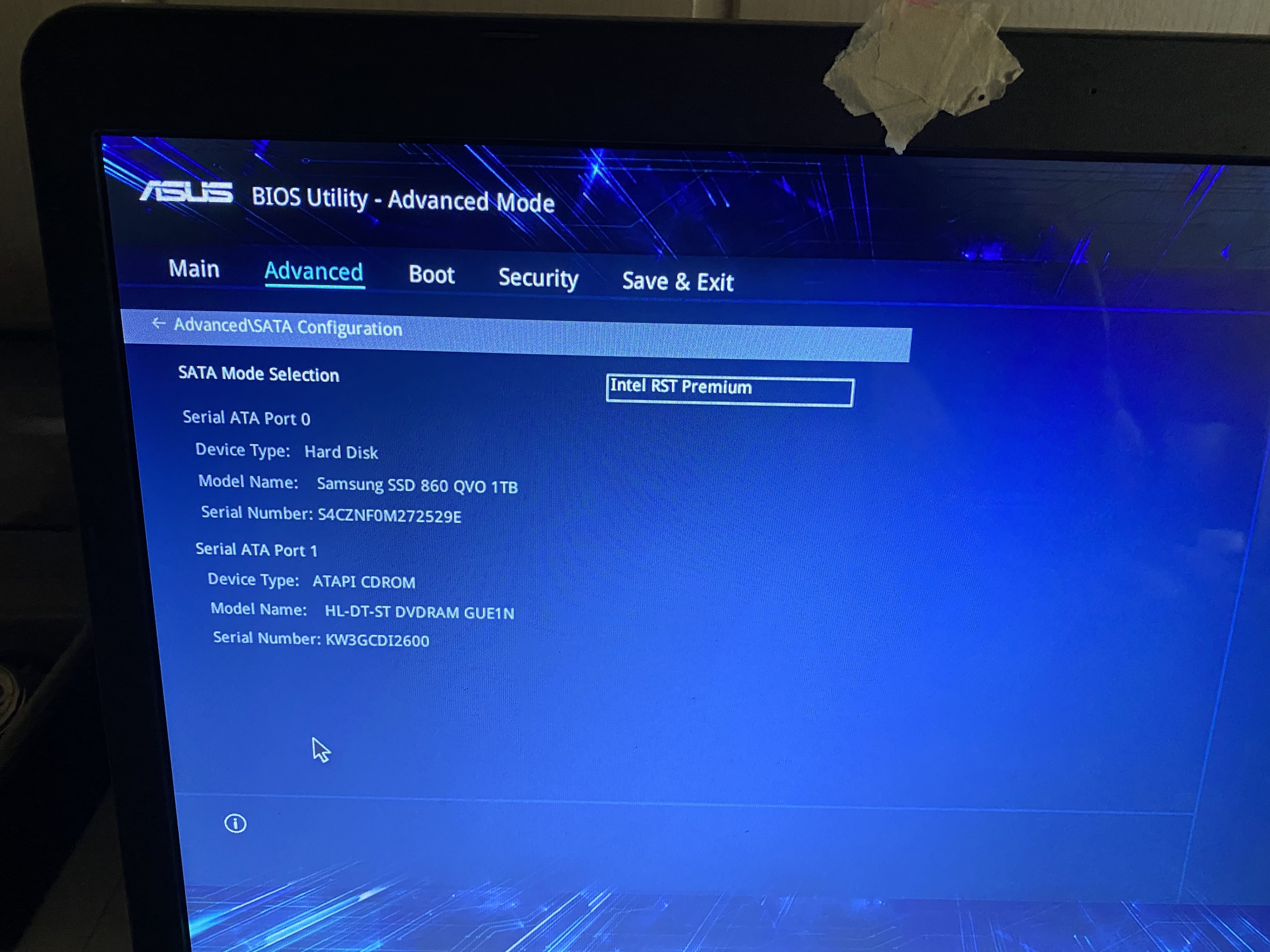 Hey, hoffe hier kann mir jemand helfen. Hab seit kurzem ein gebrauchtes Laptop. Gestern habe ich ein neues Windows installiert was auch alles funktioniert hatte. Als alles fertig war und lief bin ich ins Bios, und da habe ich einen Fehler gemacht. Ich hatte auf load optimized defaults gedrückt und seitdem lässt sich der Pc nicht mehr starten. Er geht jedes mal direkt ins Bios und dort wird mir die Ssd zwar angezeigt aber ich kann sie weder zum Booten auswählen noch sonstwas. Habe ein wenig gegoogelt aber komme einfach nicht weiter. Wenn ich die Windows cd einlege und es erneut installieren will komme ich nicht weit da er mir direkt sagt das er keine Festplatte erkennt und die Treiber fehlen würde. Ich habe mal ein paar Bilder vom bios eingefügt, ich denke es muss ja an irgendeiner Einstellung liegen aber wie gesagt kenne mich so gut wie nicht aus und bevor ich ihn weggebe dachte ich ich versuche es so. Der Laptop ist ein Asus r753u mit einer Samsung ssd 860 qvo 1tb. Wenn noch weitere Daten benötigt werden einfach bescheid geben. Vielen dank schonmal, bin nämlich echt aufgeschmissen momemtan
