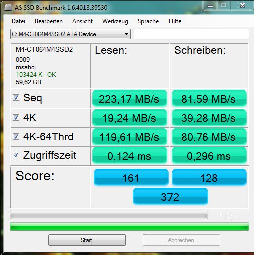 meckswell, das ist der Effekt des Caching vom MSAHCI, denn mehr als die seq. Leseraten kann da bei normalen SATA SSDs nie rauskommen und wenn sie wir hier an SATA II betrieben wird, dann sind 296MB/s sowieso unerreichbar. Für den Cache bezahlt man aber mit schlechten 4k Werten, wie man auch gut sieht. cartridge_case hat leider ein sehr schlechtes Beispiel ausgewählt, aber gegenüber den Agility3 ist die m4 immer schneller und in jedem Fall empfehlenswerter, vor allem mit 60GB.