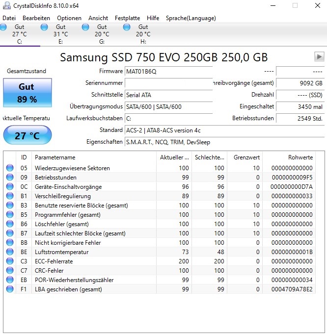 ich habe vorhin mal meine SSD mit CrystalDiskInfo überprüfen lassen und es hat mich fast vom Stuhl gehauen: Gesamtzustand lautet "Vorsicht 1 %". Konkret geht es um den Punkt Verschleißregulierung, siehe beigefügter Screenshot.